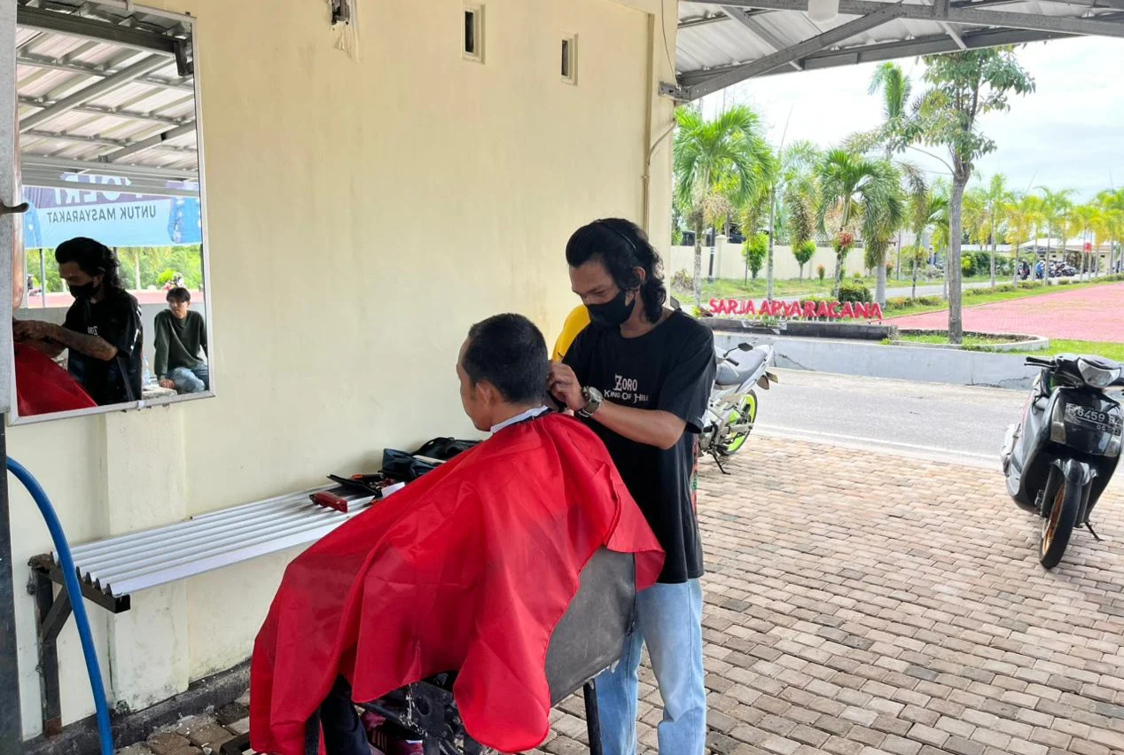 Fitra, tukang cukur yang dipercaya melayani kegiatan ini, mengaku senang karena mendapat rezeki tambahan sekaligus menjaga penampilan seseorang.
